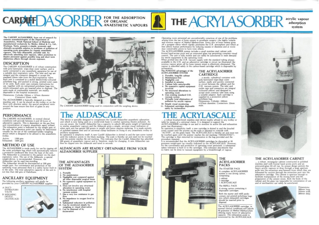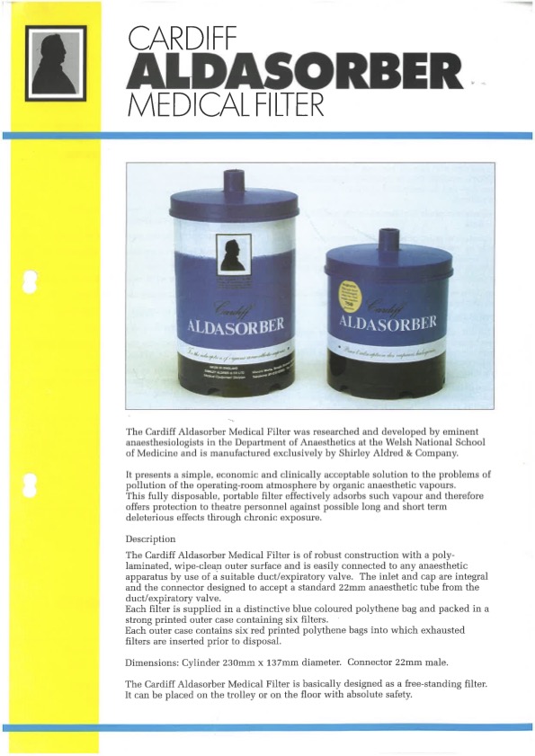 Here at Shirley Aldred, we are the original manufacturers of the Cardiff Aldasorber. The Cardiff Aldasorber was born out of research by eminent anaesthesiologists of the Department of Anaesthetics at the Welsh National School of Medicine. Shirley Aldred Ltd was originally based in Worksop until the year 1990 when it relocated to its current home in the Hope Valley. The Cardiff Aldasorber presents an economic and clinically approved solution to the problems of pollution of the operating-room atmosphere by organic anaesthetic vapours, therefore offering protection to theatre personnel against possible long and short term harmful effects through chronic exposure.